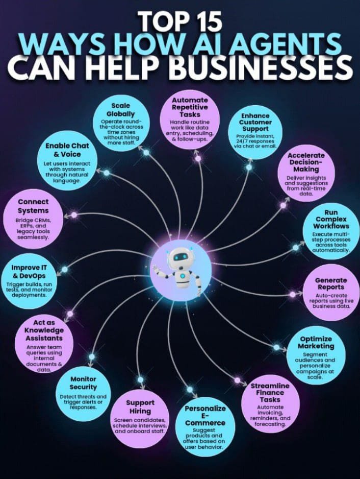 Top 15 Ways How AI Agents Can Help Businesses 1. Enable Chat & Voice Let users interact with systems through natural language. 2. Scale Globally Operate round-the-clock across time… By root on June 19, 2025